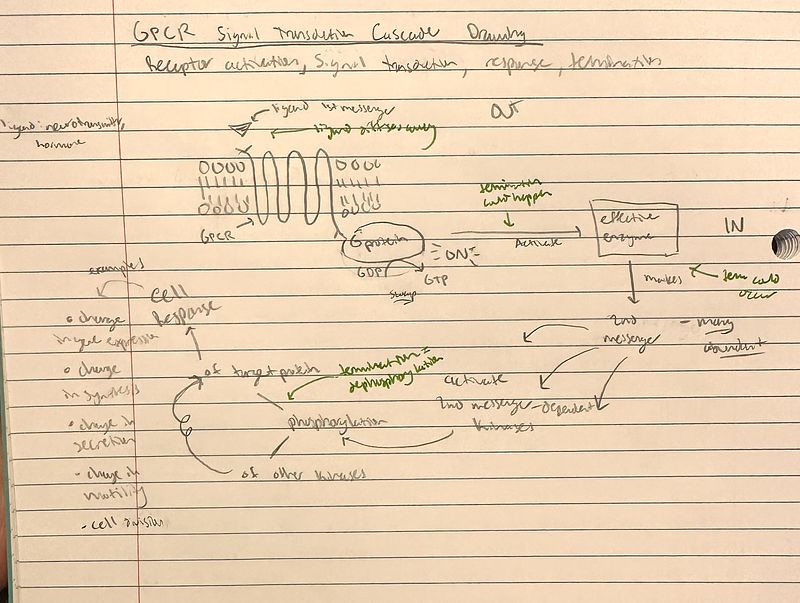 Example of BIOL 1107 student's G protein coupled receptor signal transduction pathway. Used with permission.